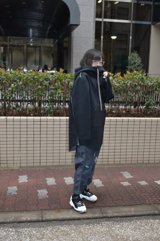 裾にリブなどがないため、ストンと落ちたシルエットに加え、9部丈ほどのイージーパンツにスニーカーという、モード感漂うコーディネートがなんともいえません。